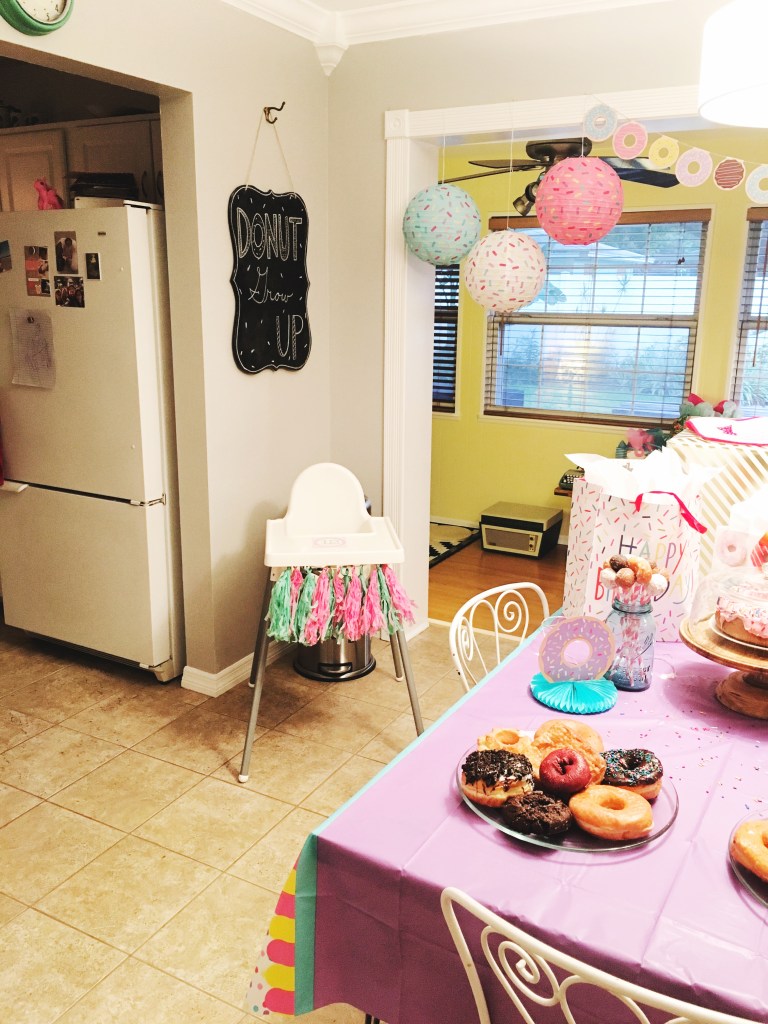 Amidst all this hurricane madness, Adelaide turned one year old! We were not going to let this stupid storm prevent us from celebrating her birthday. So on the Friday before the storm, our families gathered at our home for Addie’s donut party! We wanted to keep everything simple from the start, so we only invited family. (I used an app called HobNob to create her invitation which was sent via text message. I highly recommend it!) Our house is very small, and this worked out perfectly. We also just served donuts, ice cream, and coffee.