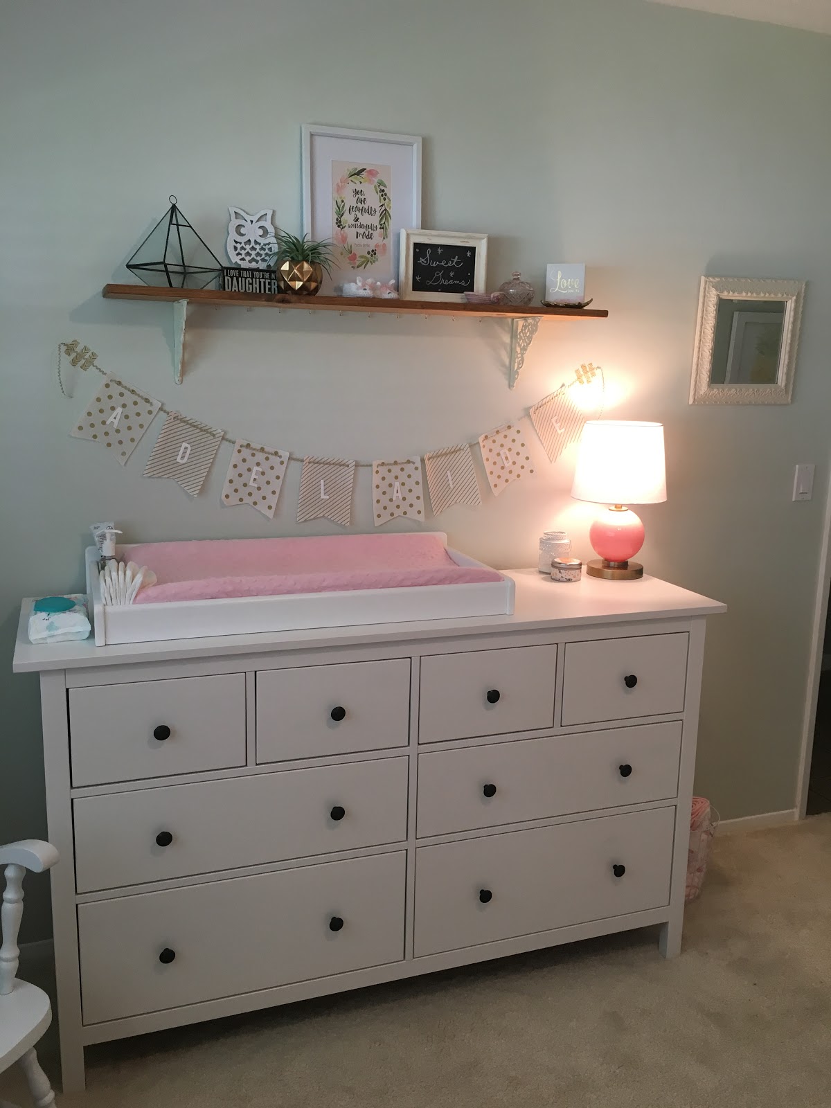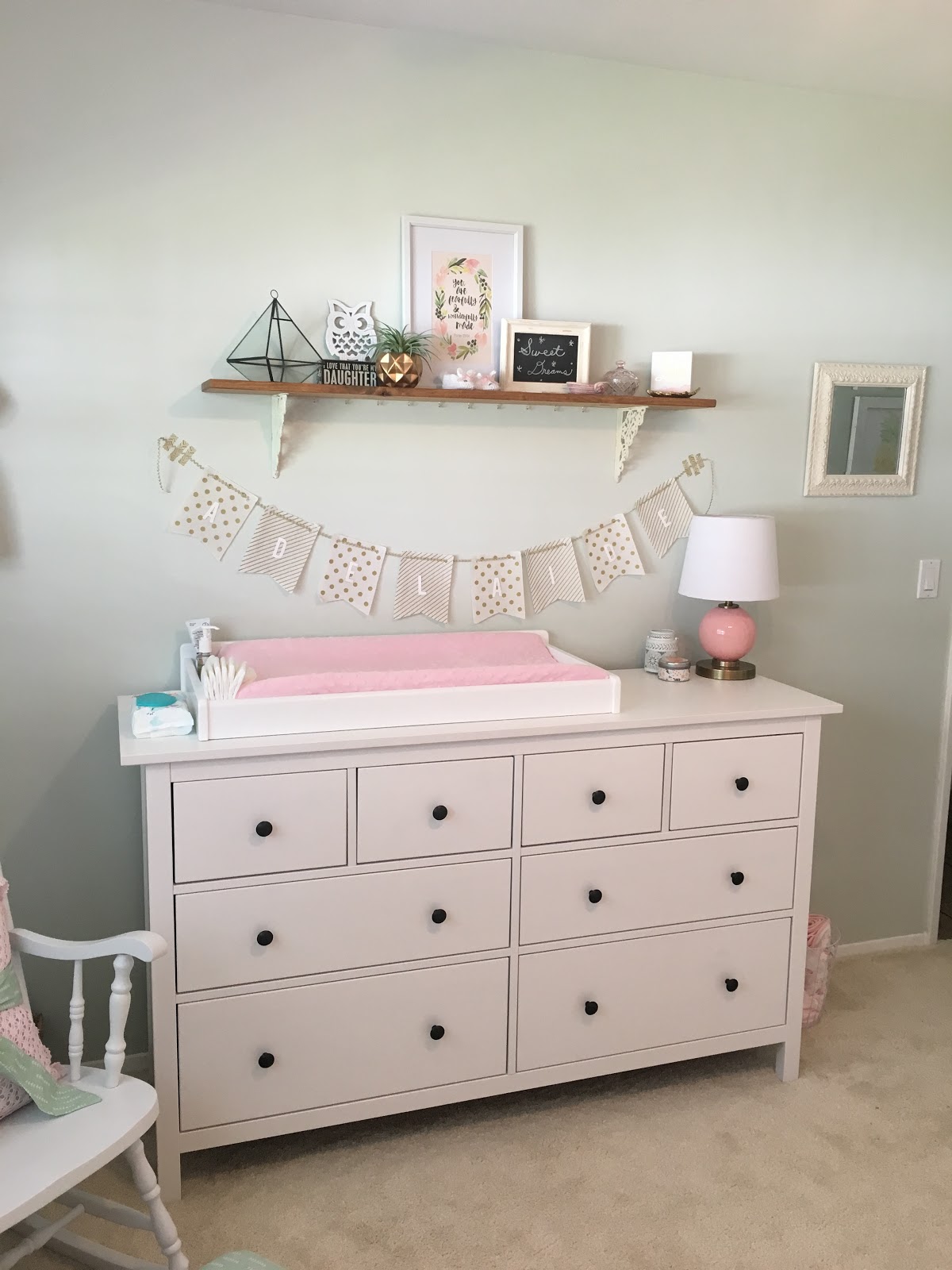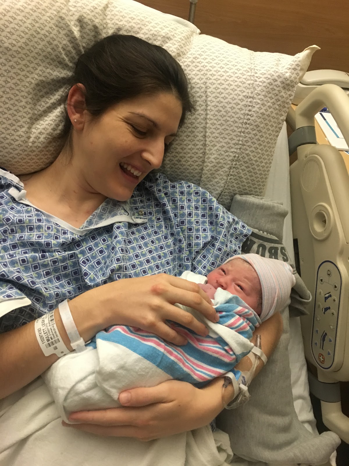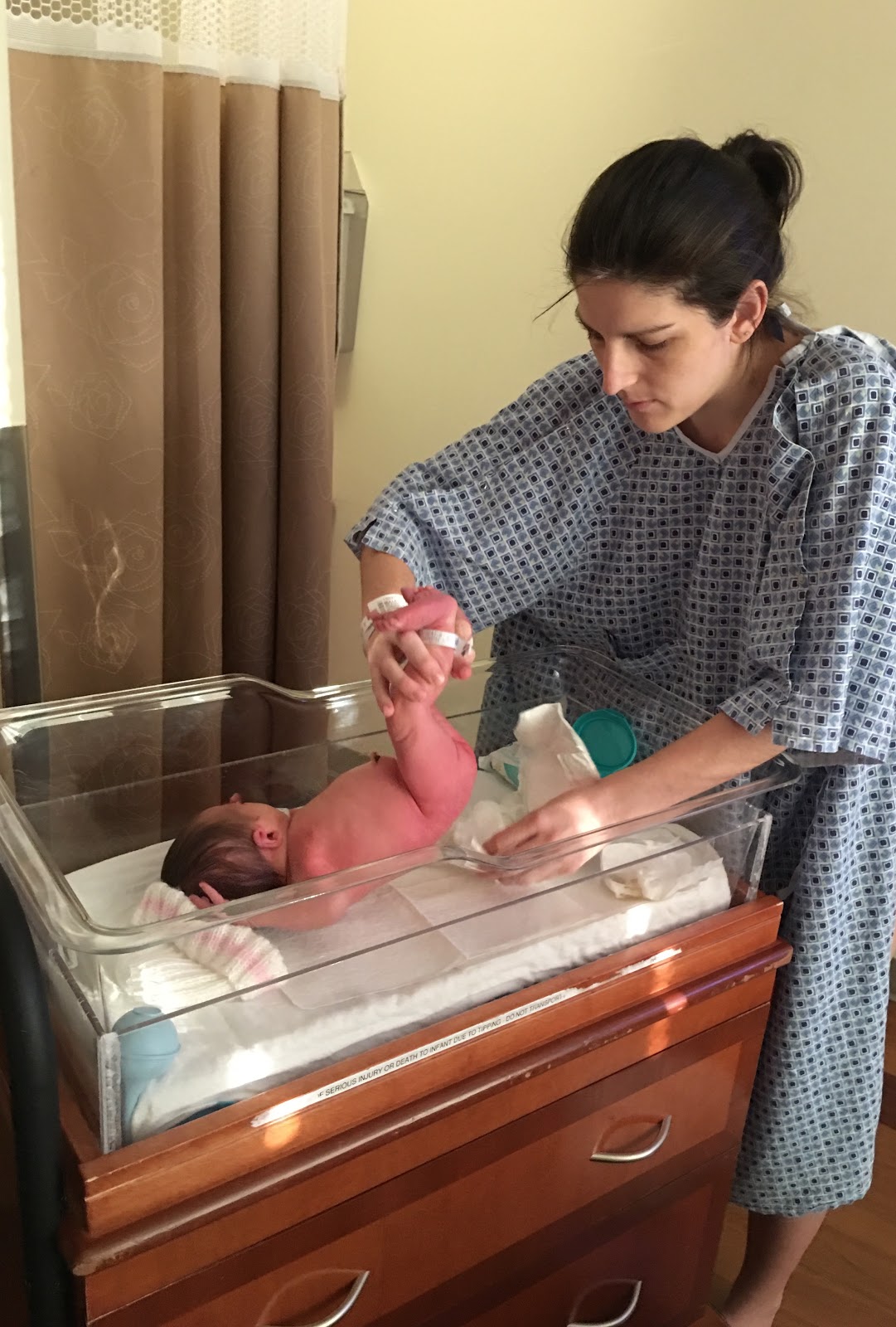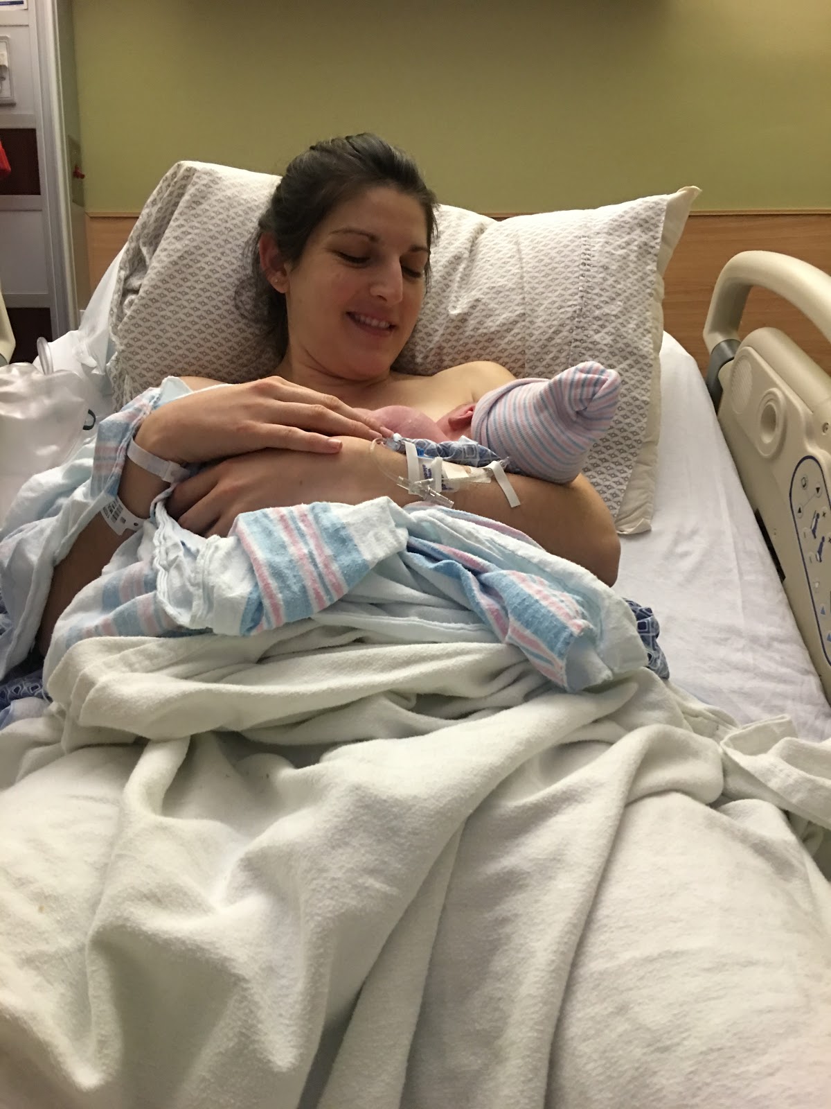 Kyle was such a huge support the entire time. He was the only one in the delivery room which is how I wanted it. The whole experience felt so laid back and non stressful. Once Addie was born there were several nurses there running all their routine tests on her. For the first several minutes, Addie just stayed on top of me (they call it skin to skin – which is very good for the baby) while they did a lot of the testing. Our sweet girl was healthy and doing great! She weighed 7 lbs 13 oz and was 21 inches long. She came out with a full head of dark brown hair! The hospital does not give newborns baths until 12 hours after they are born because babies are born with vernix that is a protective coating on their skin and has benefits outside the womb. I will say it was so sweet when the nurse did give her a bath the next day though!