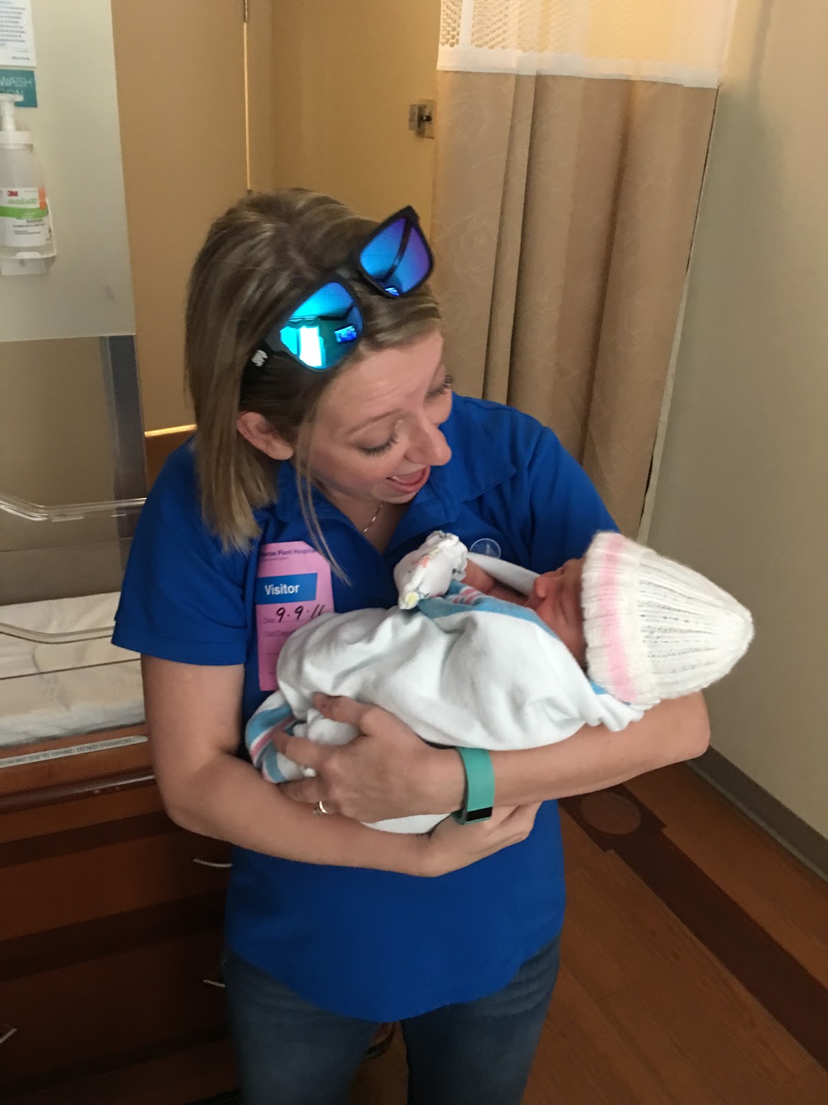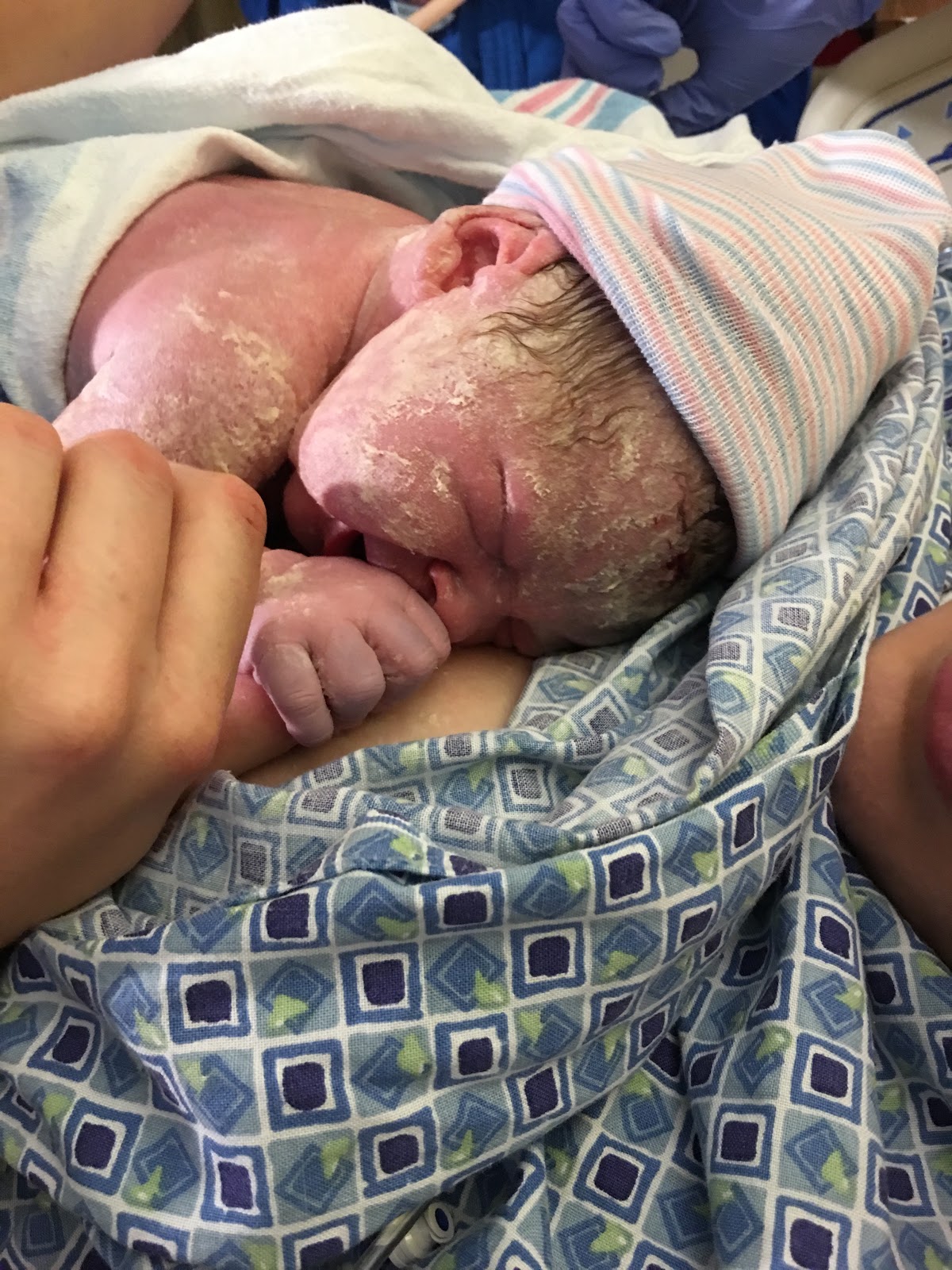 Soon the midwife came and it was showtime! Kyle was on one side and the nurse was on the other – they helped me with the pushing. I will say that I had so much of the epidural that I literally couldn’t feel anything. I honestly didn’t even know I was pushing. It was so bizarre. I will say that pushing took the most energy out of me. At one point the nurse put an oxygen mask on me in between pushing, and I thought it was because I was about to pass out or something. It was very nice and comforting. I soon found out that she was giving the oxygen to me so that it could get to our baby because apparently SHE needed it! LOL! Things regulated and the nurse said that I didn’t need the oxygen anymore – but I asked if I could still have it for myself because it helped keep me calm in between pushes. It was basically a placebo effect – but I didn’t care. It took me about an hour and half of pushing before our sweet baby girl arrived. One of the coolest things is that the midwife let Kyle help pull her out a little bit – and then the midwife told me “reach out your hands and get your baby!” and I was like “WHAT?!” and she said it again. I was totally not expecting that, but I basically pulled her out and placed her on my chest. It was crazy and amazing and I totally cried – especially when she started crying. It was so incredible. She was officially born at 6:48 pm on September 8th, 2016!