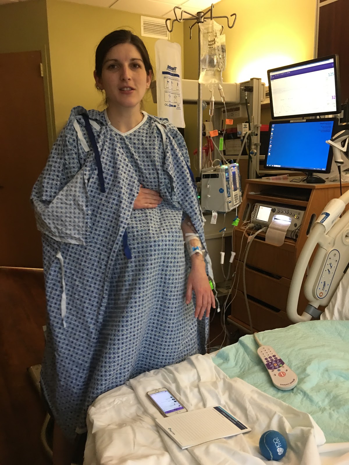 Here I am on the labor ball – this thing was actually pretty awesome. I look so big because the hospital gown is wrapped around the ball LOL!