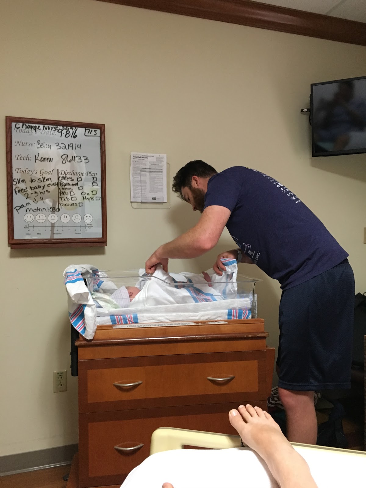 I fully anticipated getting an epidural. I definitely admire all women who have unmedicated births. I went into this with the mindset that I would go as long as I could without the epidural – but was totally ok getting one when I really needed it. The nurse on duty during the majority of my labor (Patti – she was amazing!) kept checking in on me to see if I wanted the epidural yet. Things were certainly getting more intense as the day went on, but I kept pressing on. The main reason is that I was told that if I got the epidural too soon that it can potentially stall labor. I also heard that it could “wear off” (in reality your body just gets used to it) and I didn’t want that to happen! It was my plan to wait until my next check to see how far along I was and then I’d make the decision at that point. Well, several hours went by since the 7:30 am check and the midwife hadn’t come back to check on my progress. Kyle asked the nurse that afternoon when I was going to be checked again, and the nurse said they were waiting for me to tell them when I wanted the epidural. Once I got the epidural they would then do the check. I was unaware of this LOL! Things had really gotten intense – the nurse had cranked the Pitocin up and the contractions were about a minute apart and very intense. I couldn’t talk through them and was really gripping the fire out of Kyle’s hands! At that point I finally decided it was time and I was actually worried that I had gone too long. It probably took the anesthesiologist 30 minutes to arrive. He had an assistant with him who was talking to me and having me sign all these forms before I could get the epidural. It was quite humorous because I did not listen to a word she said nor did I have any idea what I was signing. My signature looked like a third grader learning cursive for the first time! The pain was so intense at that point!